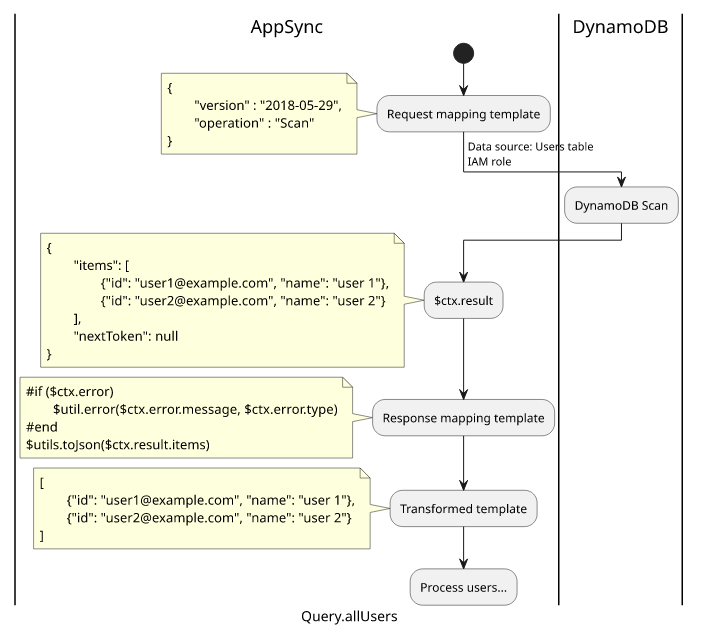 The data source is the Users table, so it uses the IAM role configured and issues a Scan request. DynamoDB sends back a response: