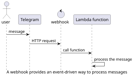 A webhook is an HTTP endpoint that Telegram calls when there is an event for the bot. It provides a way to process these events in real-time, so a bot will be responsive to incoming messages.