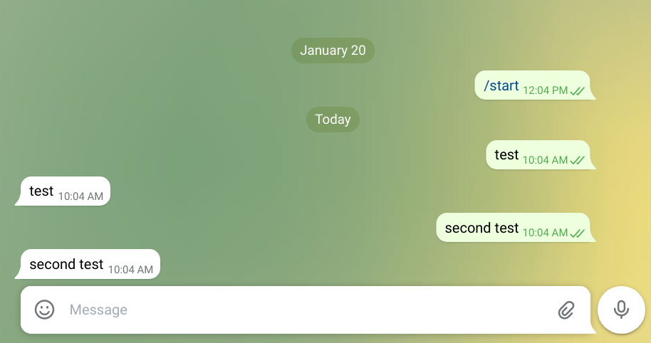 The bot is now ready to receive updates, so let's move on to how to process incoming messages and make the bot send its own to the chat. All communication is based on the bot token and the chat id. In Telegram, a user needs to initiate the chat by sending a message, but after that the bot is free to reply immediately or later. But it needs the chat id for that.