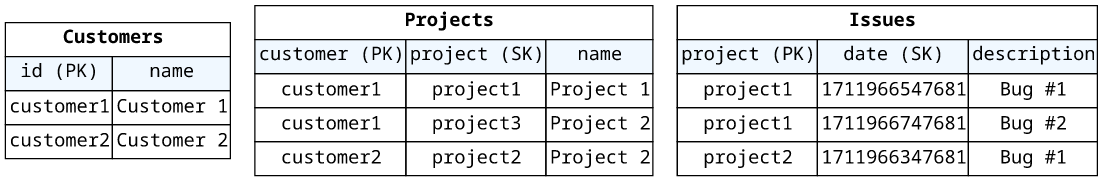 For example, in the customer-project-issue database the projects might be defined as customerid as the partition key and projectid as the sort key.
