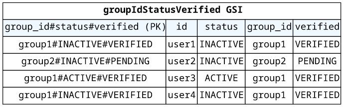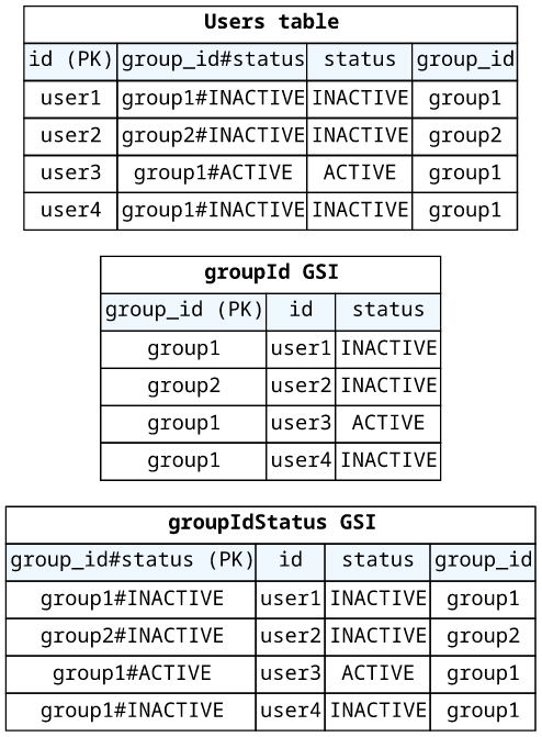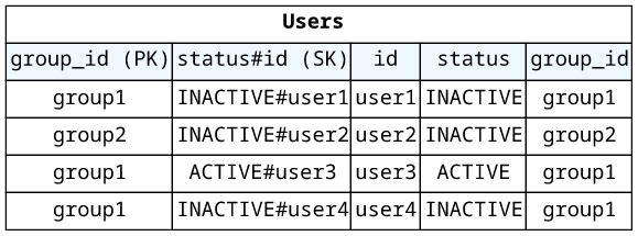 Note that when the table or the index uses this concatenated partition key then it is no longer possible to get all users regardless of status. If you know all the possible values (such as in this case ACTIVE and INACTIVE) then you can send multiple requests, one with each possible value, and merge the results. But this approach won't work for free-text fields.