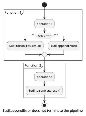Appending errors work similar to how it works for unit resolvers. AppSync keeps track of the errors appended and it returns them in the response, but otherwise it does not terminate the execution.