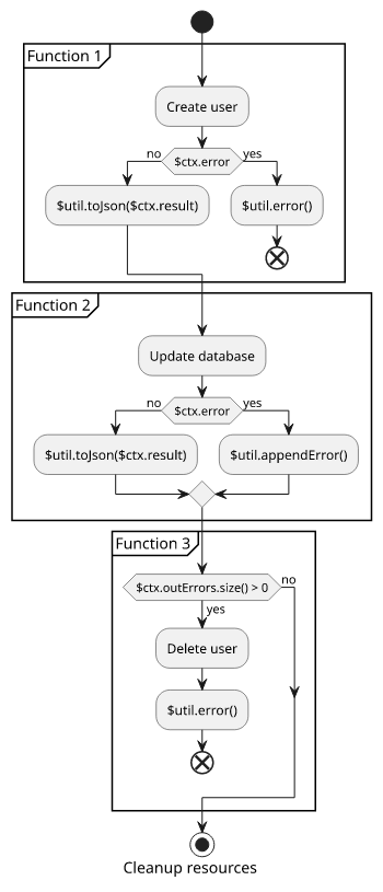 ($util.appendError). Then the third steps checks errors ($ctx.outErrors.size() > 0) and deletes the user and rethrows the error.