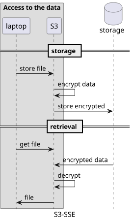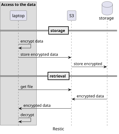 The other end of the spectrum is Restic. It's a backup manager running on your laptop and supports a lot of different backends to store the data, S3 among them. When a backup is performed, Restic encrypts the data locally with a key, then uploads the result to S3. When a file has to be restored, the data is read from S3 and then locally decrypted using the key.
