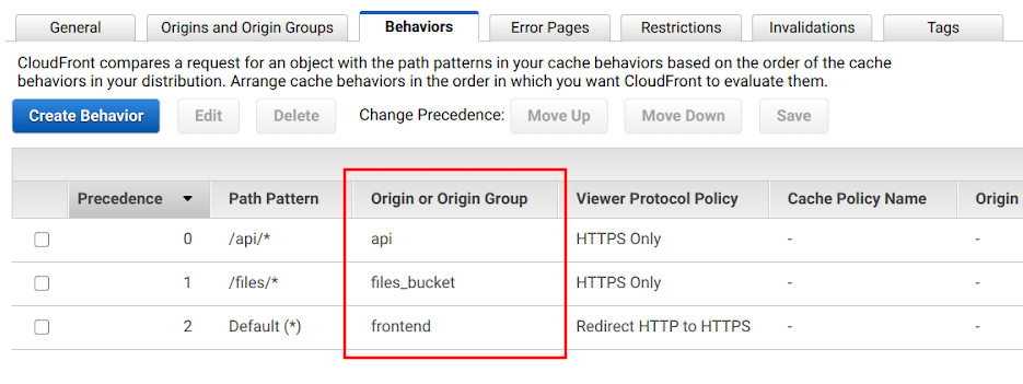 Each cache behavior defines an origin via its Origin ID. The first matching behavior's origin will be used for the request.