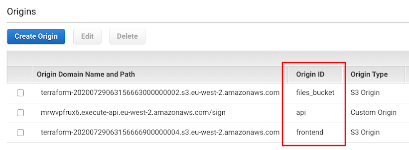 To find the origin configuration, select the origin with the matching Origin ID. This contains the domain where CloudFront forwards the request.