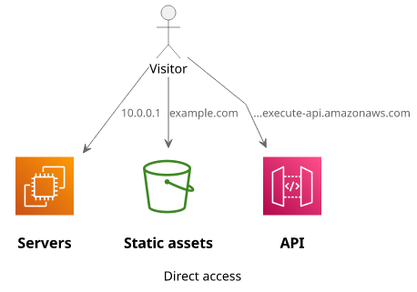 Without CloudFront, each origin has its own name or IP address where it can be accessed and clients connect to them directly. For example, EC2 servers can have