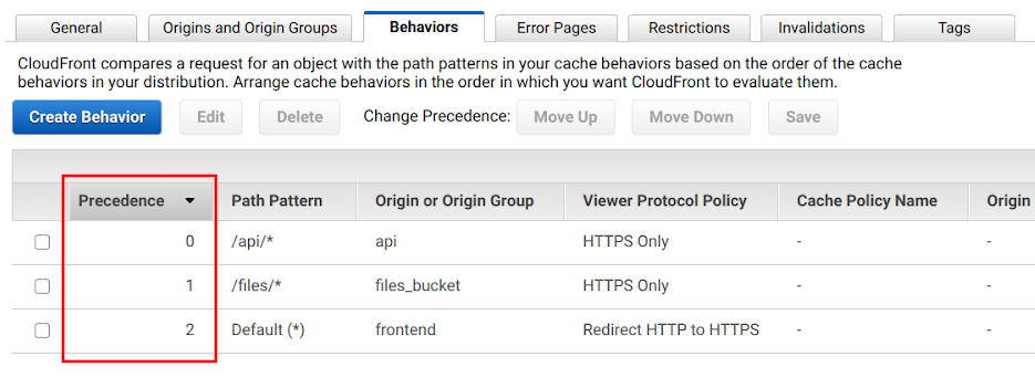 When a request reaches the distribution, CloudFront starts from the top and tries to match the path patterns for each cache behavior. The first one that matches wins.