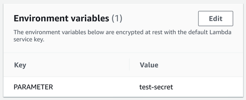 Finally, the function needs to know the name of the parameter. This avoids the need to hardcode this value and it allows deploying identical environments. An environment variable is a good place to store it: