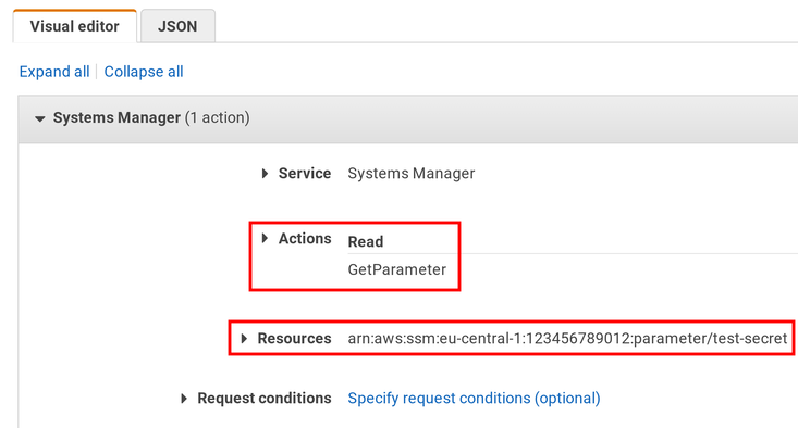 By default, the Lambda function can not read this value. Let's add a policy that grants access: