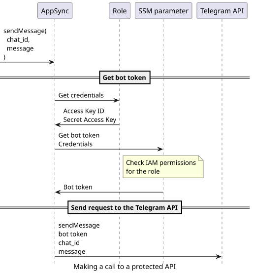 We'll use the SSM Parameters Store to securely persist the bot token, a sensitive information that is the API key for all bot-related operations. Then we'll use an HTTP resolver to retrieve the value using an IAM Role and a policy attached to that role.