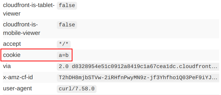 Similarly, you can debug how cookies and query parameters are forwarded too. These are also changed by CloudFront, depending on the cache behavior settings: