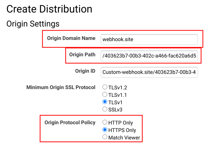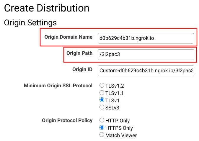 To point the distribution to this debug endpoint, modify the Origin Domain Name and the Origin Path. Since ngrok provides an HTTP as well as an HTTPS URL you can keep the Origin Protocol Policy on what you use for the real origin.