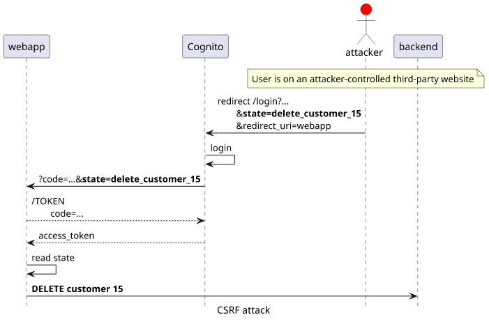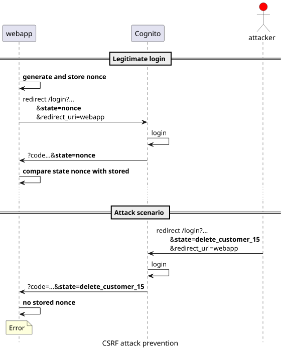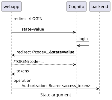 state. Then, when Cognito redirects back to the webapp it needs to compare the stored and the received state values and throw an error if they don't
