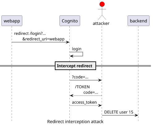 The other security problem comes when Cognito redirects to the webapp with the code parameter. The next step is to use the TOKEN endpoint to exchange this