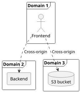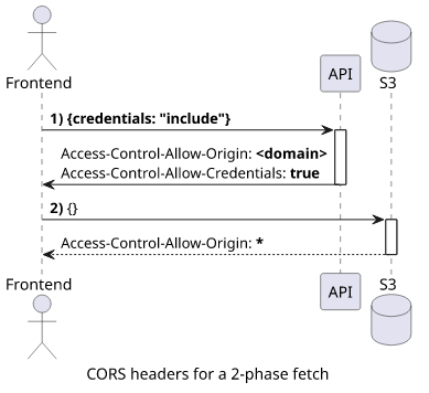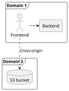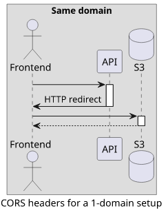A step towards simplifying infrastructure and CORS is to use fewer domains. Let's investigate a setup where the frontend and the backend are on the same domain but the private bucket is on a different one. This can be configured with CloudFront.