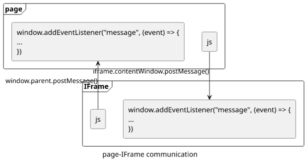 call sends a message to the IFrame, while the window.parent.postMessage() sends a message back to the main page. The two ends can listen to messages from the