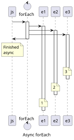 as, by the time the next line is executed, the synchronous forEach is already done, while the async version is not.