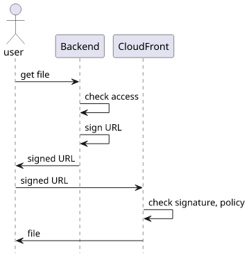 CloudFront signed URLs allow access to a path under a distribution. The backend has access to the private part of a key pair and its public counterpart is added to CloudFront as a trusted key. Then whenever the backend wants to allow a user to access a path it constructs a special URL. Part of this URL is signed with the private key, which makes it unforgable to parties not having the private key.