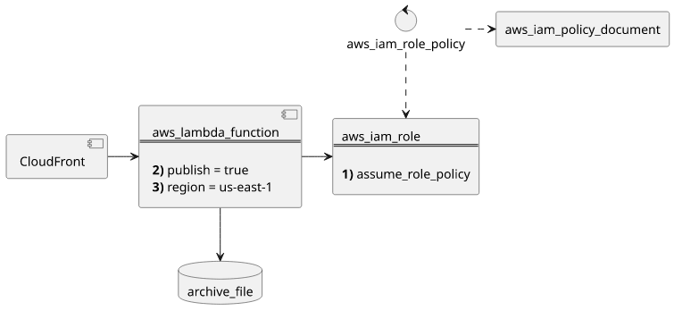 The usual Lambda resources are needed: an archive_file to hold the code, an aws_iam_role for the execution role, an aws_iam_policy_document
