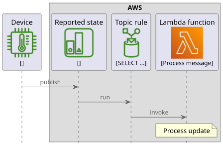 In this article, we'll build a topic rule that calls a Lambda function every time the reported state of a device changes. This builds upon the shadows service, as that defines the reported/desired state distinction. But topic rules are not tied to shadows; they work with any MQTT topics.