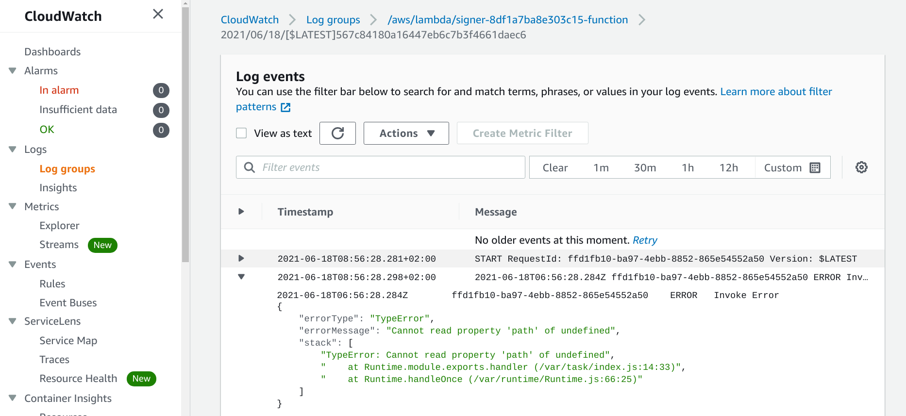 The easiest way to debug what happened is to look at the Lambda logs in CloudWatch Logs:
