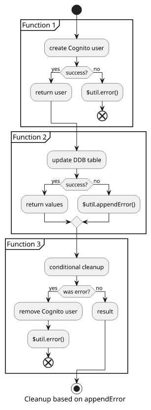 It makes sense to add a third function to the pipeline that undoes the Cognito operation if there was an error with DynamoDB. But for that to work, the DynamoDB