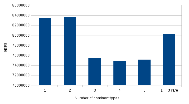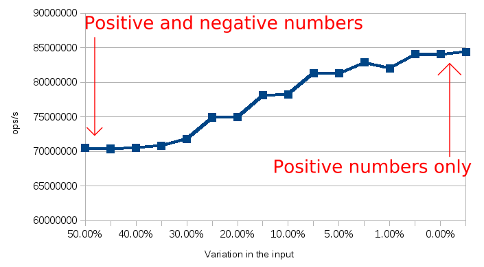 As it can be seen on the chart above, the more predictable which branch will be taken, the better it can be optimized. The system quickly follows the changes in the trends, for example, changing from only positive numbers to only negative barely impacts the average performance.
