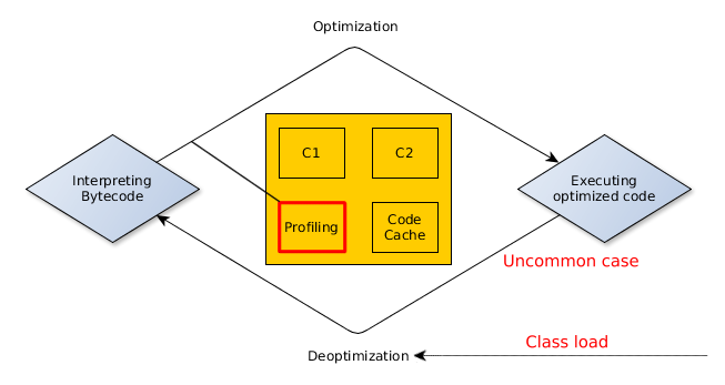 If the runtime behavior changes dramatically, for example, by supplying unusual input, some optimizations made by the JVM may cause problems. If the condition in the example above ever becomes true the optimized code would not work as expected, so the code has to be deoptimized before continuing. Later, the compiler might attempt to optimize the related code again, taking the new information into account.