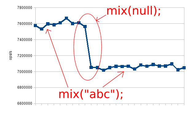 The implicit null-checking has a cost, but the JVM can optimistically omit it if the collected runtime profile shows that no nulls are passed to this method. The following diagram illustrates what happens to the performance characteristic of the sample program after deliberately injecting a few nulls.