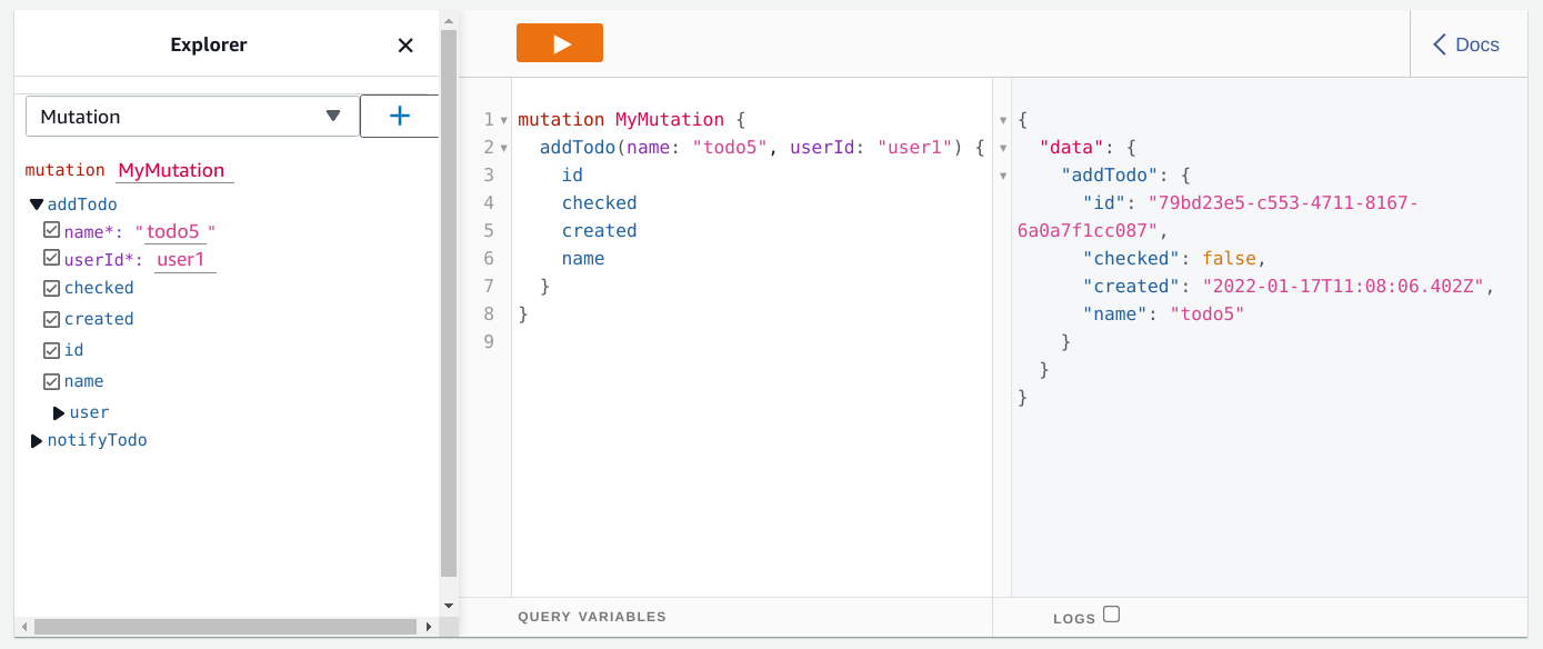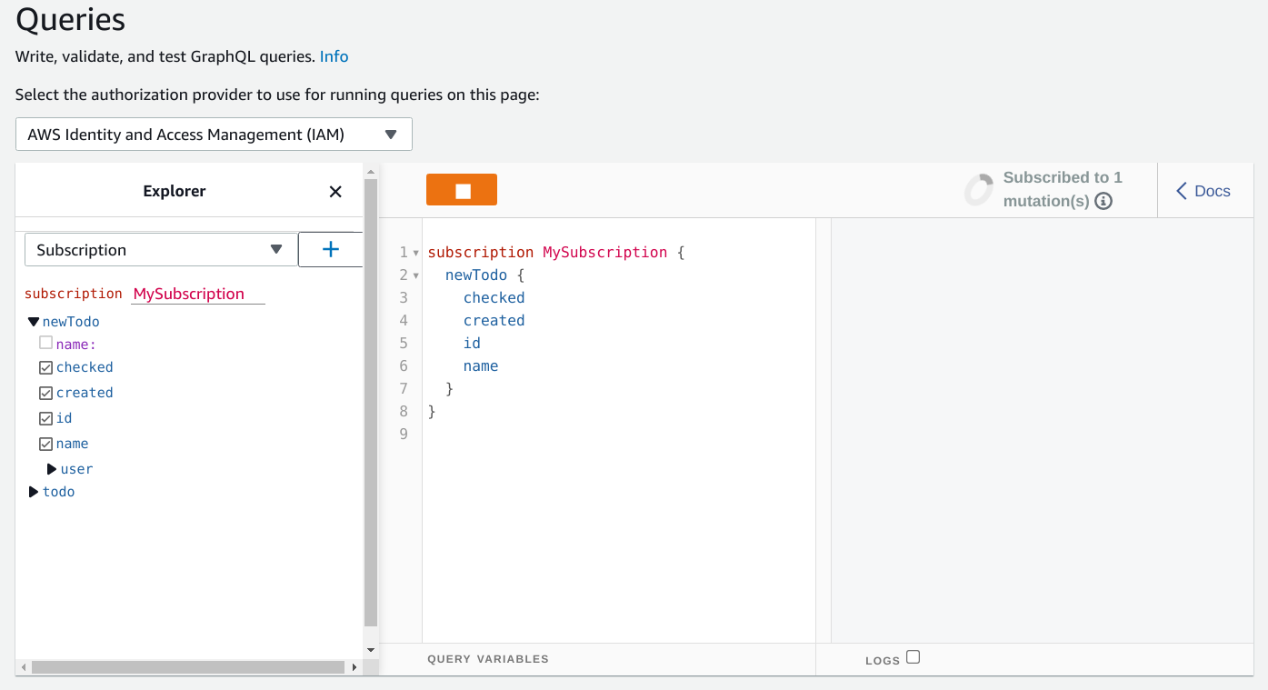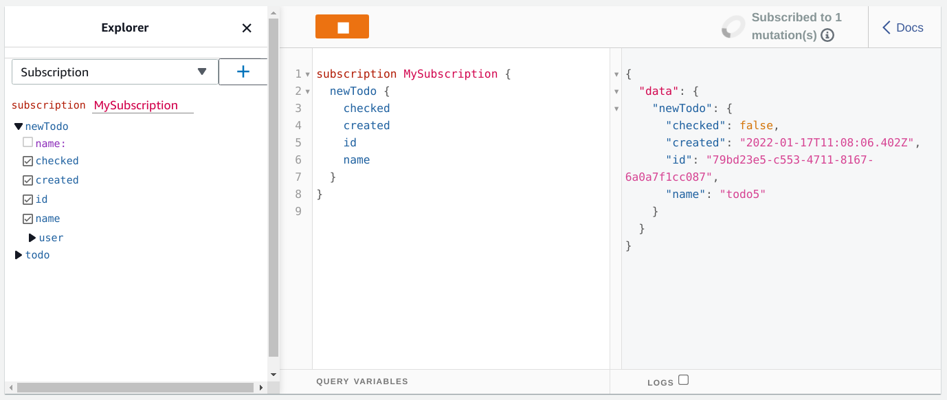 Notice that the mutation returns a Todo!, but the subscription's return value is optional (Todo). This is a requirement in AppSync and subscriptions