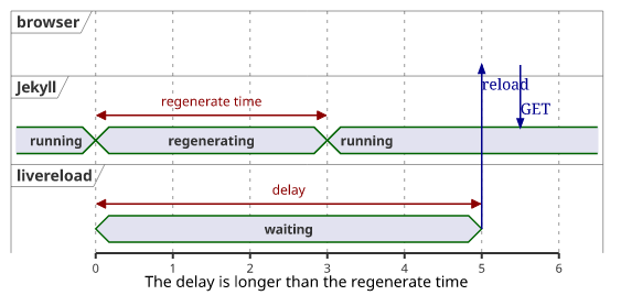 You can see that the delay between the end of the rebuilding and the browser refresh is gone and since there is no hardcoded value it adapts to the length of the Jekyll refresh.