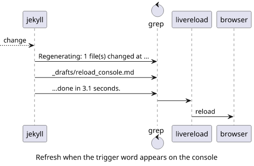 But there is a universal event bus that can connect the two parts: the console. Jekyll prints an easily-identifiable message when it's ready, just like the Express app above.