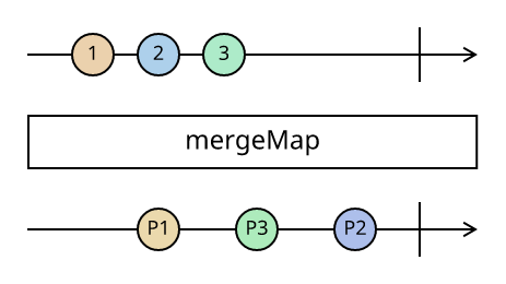 mergeMap emits elements as they are ready and does not keep the original ordering of elements.