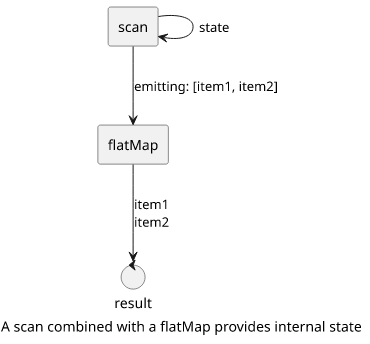 Then a scan with a flatMap (=mergeMap) structure that allows storing intermediate values as the result of the scan and also emitting