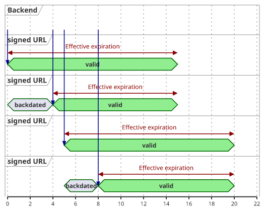 This rounding has implications on the expiration time though. As it effectively backdates the signature the expiration time also comes closer to the actual signing time. In the above case the effective expiration is between 10 and 15 minutes.