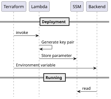 Notice that these secrets are different than the MongoDB password we discussed earlier. The exact value of the IVS key pair does not matter, it is only needed to be usable inside the stack. It does not matter if it changes as long as both the IVS and the backend part is changed as well. There is no need for these keys to be stable or usable outside the stack.