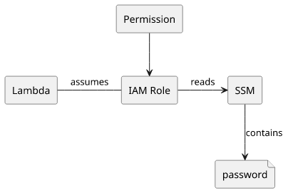 For example, a Lambda function might need to connect to a MongoDB database. Since it is outside AWS, IAM permissions won't work, instead, a password is needed. How should the Lambda get this password? Put it into Parameter Store, then use IAM permissions to give the Lambda's execution role access to the parameter.